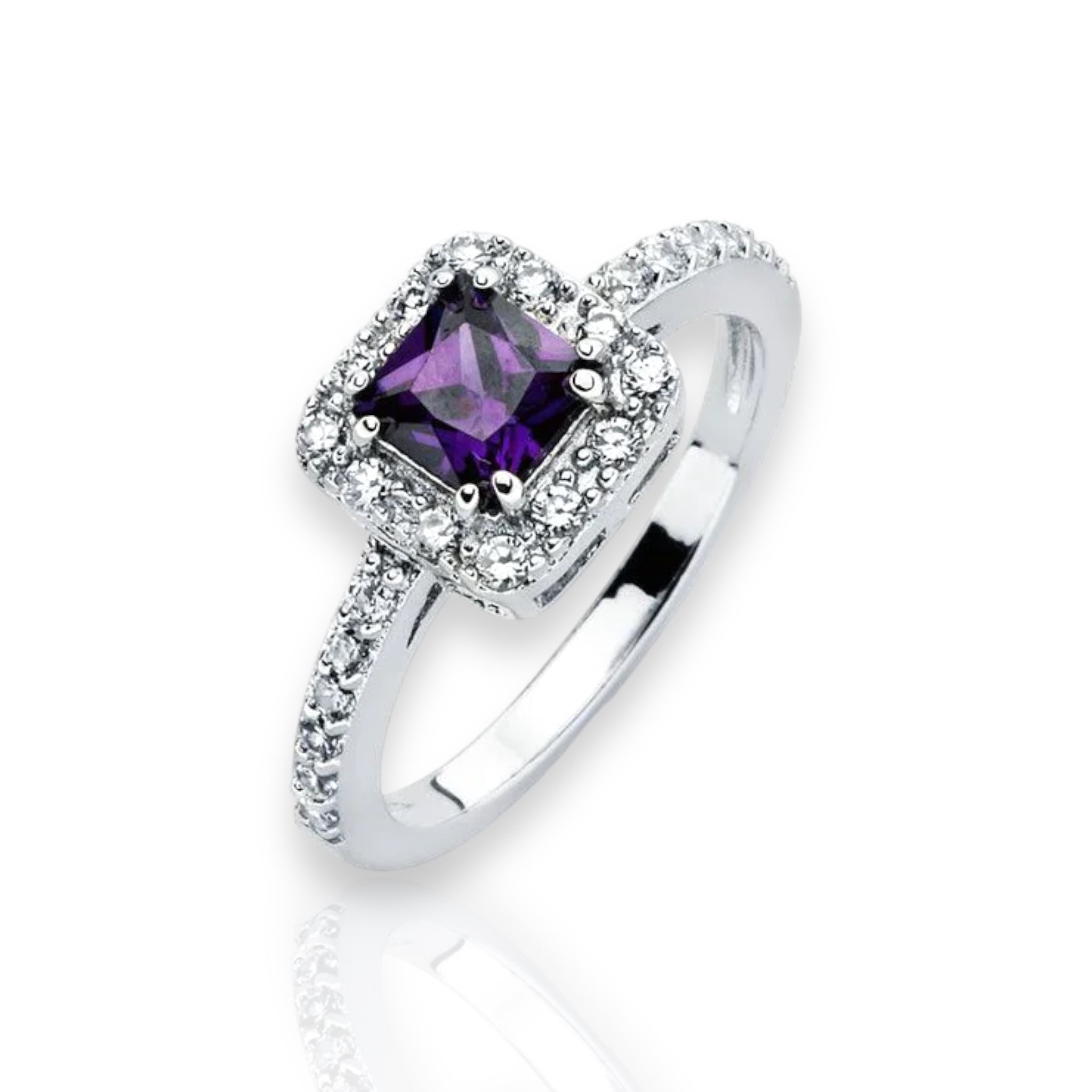 Sterling Silver 925 Rhodium Plated Clear Micro Pave Set and Square Purple Center CZ Bridal Ring